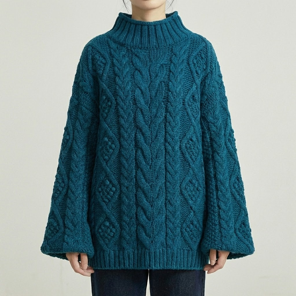 Wrap yourself in comfort with this cozy teal cable-knit sweater. Featuring a chunky, textured cable pattern and a relaxed, oversized fit with wide sleeves, this sweater is perfect for chilly days. The ribbed mock neck and hem add a classic touch. Pair it with jeans for an effortless, casual look.